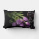 Verre de vin et tulipes violettes sur plateau argenté sur noir.