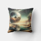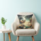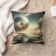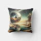 Cette sphère métallique patinée et surréaliste reflète un paysage désertique apocalyptique et baron, avec des arbres morts, le feu et la fumée.