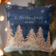 "Rose de la Marine Parties scintillant d'or Forêt d'hiver Nom de famille Jetez l'oreiller." Votre nom de famille dans la calligraphie script avec fleurit avec l'année établie (ou vous pouvez changer à n'importe quel message que vous préférez). Eau bleu marine riche laver bois arrière - plan avec des arbres de parties scintillant en or rose rousse sur une colline enneigée avec trois cerfs et des flocons de neige stylisés. Toutes les oeuvres créées par Audrey Jeanne Roberts, artiste et designer de renommée internationale, copyright.