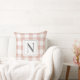 Un oreiller jeté à carreaux gingham rose et blanc avec une initiale de monogramme personnalisable dans un cadre carré charbon. Le plaid à grande échelle associé à l'initiale classique du nom de famille crée un accent féminin et cosy pour les salons, les chambres ou les nurseries. L'initiale est entièrement modifiable pour personnaliser avec la lettre du nom de famille.