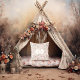Un élégant motif rose vintage aux fleurs bleues et blanches oniriques sur des vignes brunes