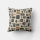 Earthy geometric pattern throw pillow inspired by tribal mudcloth textiles, featuring hand-painted rectangles, diamonds, and triangles in charcoal black and terracotta on a textured beige background. A warm boho design ideal for rustic décor lovers, artisan style fans, and anyone drawn to earthy geometric aesthetics.