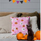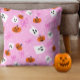A cute hand drawn illustration of festive blend of ghosts and pumpkins on a vibrant pink background, evoking a playful Halloween spirit.