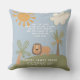 Un mignon coussin chrétien en pépinière avec une scène illustrée sur le thème de la jungle d'un lion, palmiers, soleil et nuages. Le verset biblique tiré de Luc 2:40 est modifiable. Personnalisez avec le nom de l'enfant et les statistiques de naissance en blanc. Fait un grand cadeau nouveau-né.