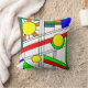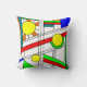 Cet oreiller de lancer a un design moderne du milieu du siècle d'un look de vitrail avec des lignes noires et des cercles remplis de couleurs primaires et secondaires.