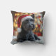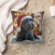 Un chien écossais en fer blanc vêtu d'un chapeau de Père Noël est assis sur un tapis moelleux devant un sapin de Noël festif orné de lumières.