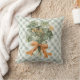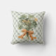 Ce coussin de la Saint-Patrick présente un arrangement de trèfle à quatre feuilles aquarelle noué avec un ruban orange et un fond à carreaux vert et blanc coordonné sur le devant et le dos.
