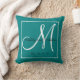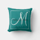 coussin monogrammé turquoise, noir et blanc personnalisé avec vos noms de mariée et de mariée et date de mariage dans une superposition de police de script sur un arrière - plan de couleur solide. Elke Clarke© Fait un grand cadeau pour les jeunes mariés. Disponible à l'adresse www.zazzle.com/monogramgallery. Fait un grand cadeau pour les jeunes mariés. Magnifique accessoire tendance et élégant pour votre chambre, chaise préférée, décor de maison amusant dans votre chambre familiale ou ajout décoratif formel à votre salon. Autres styles et couleurs disponibles dans notre boutique. Customisez avec vos noms, monogramme date initiale et mariage.