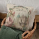Vélo Vintage rose antique Paris Throw Pillow Cushion présente un collage de l'architecture française avec des fleurs roses antiques avec une superposition de script français. Parfait pour le décor de maison ou comme cadeau d'anniversaire, la fête des mères ou Noël. Conçu par Evco Studio www.zazzle.com/store/evcostudio