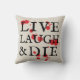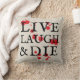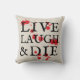 Une version ironique de "live, laugh, love" cette saison d'Halloween lancer l'oreiller dit "live, laugh & die" plus une jolie tache de sang pour apporter cette dose supplémentaire d'horreur à votre décor domestique surélevé mais éffrayant.