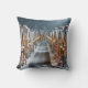 La neige tombe doucement sur une charmante rue du village avec des maisons en pain d'épices ornées de sucres de canne et de lumières festives. Le dos est bleu foncé avec des flocons de neige.