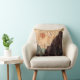 Cet oreiller décoratif à jetons présente un collage en mosaïque abstrait motif d'une petite figure assise sur un sommet de montagne noir et marron réfléchissant à la nature de l'univers alors qu'un soleil orange se lève dans un ciel de couleur saumon pâle. Plus de collines sont au loin ainsi que l'océan bleu turquoise.