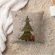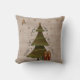 Amusant, arbre de Noël fantaisiste avec des cadeaux en dessous. Arrière - plan est un faux look de lin en bronze et il y a des étoiles rustiques dans le ciel. Reverse side a le même arrière - plan bronzé avec des feuilles saints et des baies et il dit "Joyeuses fêtes". Un coussin si amusant pour décorer votre maison de campagne ce Noël !