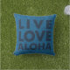 Couleur bleu Denim. Live, Love et Aloha est le message sur ce coussin artificiel qui revient à une version positive du motif Zebra Palm au dos. Ces simples feuilles de palmiers graphiques ont été inspirés par les palmiers balançants. Leurs bandes simples nous rappellent les motifs sur un zèbre. Deux motifs de couleur comme ceux-ci ont souvent été utilisés dans les motifs vintages des chemises Aloha et Muu-Muus. Il s'agit d'une solution qui se coordonne avec d'autres produits d'ameublement et qui se décline en plusieurs couleurs.