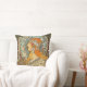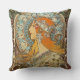 Un oreiller à lancer avec la lithographie, Zodiac (1896) par Alphonse Mucha, illustrateur et peintre d'origine tchèque. Portrait d'une femme avec des bijoux dans les cheveux assis devant un tableau de zodiac.