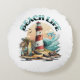 Lave oreiller à thème sur la plage. Illustration d'une scène de plage avec phare, planches de surf, palmiers et dauphin.