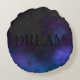 Lancer rond oreiller avec le mot "rêve" en lettres majuscules noires solides dressé contre un ciel étoilé noir doux au milieu des nuages d'espace nébuleux bleu et violet. Subtil, sombre et profond comme le royaume mystérieux des rêves. Utilisez le modèle de texte pour ajouter un nom ou une citation courte inspirante. ♡ Idyllfire
