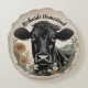 Une adorable ferme au printemps avec une vache noire et des fleurs.