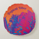 Ressentez les Vibes Tropicales de ce coussin rond psychédélique pop art avec des teintes multicolores vives de frondes de palmiers orange, rose, bleu et violet. Ces coussins sont amusants, vibrants et colorés ! Nature avec une pop ludique de couleur vive. Personnalisez avec un Nom ou votre propre texte. Cette image est une photo naturelle originale de JLW_PHOTOGRAPHY
