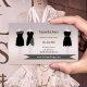 Carte de visite moderne avec des exemples de robes sur un arrière - plan gris rose chic. Vous pouvez faire glisser ou supprimer les exemples et vous pouvez également supprimer l'image du étiquette si vous n'en avez pas besoin. Pour toutes les options, choisissez "personnaliser". Beau carte de visite pour tous les acteurs de l'industrie de la mode ainsi que pour des cours de couture ou une couturière.
