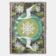 Belle couverture de Noël de Noël offre un ciel nocturne avec des petites étoiles scintillantes, des arbres à feuillage persistant, des flocons de neige blancs, un anneau de turquoise solide avec quelques flocons de neige blancs, et un centre vert avec de minuscules pois blancs. Deux silhouettes de cerfs blancs ornent ce joli tableau de vacances et il y a un espace que vous pouvez facilement personnaliser avec votre nom de famille.