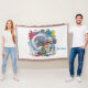 A bold, humorous cartoon illustration featuring a frantic chef with a large mustache, wearing a classic white toque and uniform splattered with bright primary colors. He struggles to control an oversized gray stand mixer as an explosive burst of white batter or frosting erupts violently from the bowl. Vivid splashes of magenta, cyan, and yellow paint fly across a light blue background, while overturned mixing bowls float mid-air, amplifying the sense of chaos. Rendered in a graphic, high-contrast style with thick black outlines, this energetic artwork captures culinary mayhem with playful, comedic flair.
