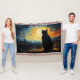 Bêtes drôles de Whimsical, ville de nuit et ciel étoilé. Le mignon petit chat noir regarde vers le ciel étoilé inspiré par Vincent van Gogh. Paysage imaginaire coloré. Peinture à l'huile numérique, art.