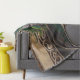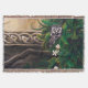 Un homme vert avec un mignon ami hibou sur une branche d'arbre. Un noeud celtique travaille en pierre derrière eux sur un mur