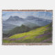 Un pré vert et luxuriant rempli de fleurs sauvages violets éclatants s'étend au premier plan sous un ciel bleu vif. Des montagnes bruyantes s'élèvent majestueusement dans l'arrière - plan, créant un paysage serein et tranquille.