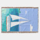 Monogram Voilier Côtier Tropical Throw Blanket. Un voilier avec votre nom sur elle s'approche d'une plage. Vue sur la mer tropicale. Bleu, turquoise, mousse de mer, turquoise, vert, blanc.