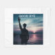 Cette image représente la silhouette d'un homme debout dans l'eau peu profonde avec son bras levé vers le ciel. L'arrière - plan présente un coucher de soleil serein, avec à l'horizon des teintes rose, orange et bleu profond. L'eau calme reflète les couleurs du ciel, créant une atmosphère tranquille et onirique.