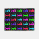 Cinq aliens colorés avec grand rougeoyer observe retardant le signe de paix avec une main. Conçu par la sucrerie Adams.