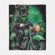 Un ami en fureur derrière les guidons d'une moto verte brillante, portant une tenue verte de la Saint Patrick qui fait tourner la tête. Le chat est habillé dans un ensemble festif, avec une cravate arc-en-ciel verte et un chapeau haut assorti qui se trouve doucement au-dessus de la tête. L'ensemble présente des motifs complexes de shamrocks et de leprechauns, ce qui indique clairement que ce chat est prêt à célébrer la Saint Patrick avec style.