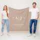 Cette couverture en toison offre un design minimaliste moderne avec un monogramme et le nom et la date du mariage des jeunes mariés. L'arrière - plan est de couleur sable clair et peut être changée en n'importe quelle autre couleur. C'est un grand cadeau personnalisé pour les jeunes mariés.