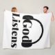 Cette couverture en toison présente les mots "Dieu écoute" en caractères gras avec des lettres noires montrant un ensemble de casques au-dessus de l'expression Dieu écoute dans ce style et thème basé sur la foi. Cette couverture est faite à partir d'une molleton en polyester 100% beurrée, douce et douillette, avec une sublimation couleur pleine éclatante de bord à bord et une couture à double tranchant avec une machine arrière de couleur blanc cassé lavable.