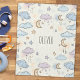 Cette couverture en toison personnalisée présente une illustration schématique d'étoiles joueuses, de lunes de croissant et de nuages moelleux à l'aquarelle pastel douce.