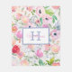 Style romantique, bohème, boho. Fleurs douces et féminines aquarelles aux couleurs rose, vert et pêche avec feuillage vert sur un arrière - plan blanc. Modèle pour un nom de famille et une lettre monogramme. La lettre monogramme en couleur lavande et le nom en rose. Le nom est écrit avec un script de style écrit à la main.