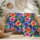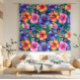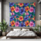 Un imprimé tropical audacieux et maximaliste avec de grandes fleurs violettes, orange et roses sur un arrière - plan bleu foncé.