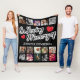 Une couverture fleurie commémorative personnalisée avec un arrière - plan noir élégant qui peut être changée en n'importe quelle couleur, 15 photos personnalisées, les mots "en mémoire d'amour de", deux coeurs rouges, et leur nom.