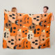Cette grande couverture en toison a un design de jack-o-lanternes avec des visages différents se répétant dans chaque trimestre.