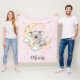 Cette couverture personnalisée pour filles présente un koala mignon bébé enroulé en dormant sur une lune au croissant avec des étoiles brillantes sur un arrière - plan rose pastel fantaisiste.