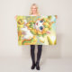 Le Décor : Elle se tient dans un champ parsemé de fleurs jaunes et de rondelles de bananes, sous un soleil éclatant. En arrière-plan, on aperçoit des palmiers et des bananes volantes avec des petits visages souriants.