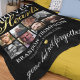Élégante couverture de saké de souvenir avec 6 photos carrés de votre être cher perdu, le texte "pour toujours dans nos coeurs", leur nom, date de naissance/mort, un faux coeur de feuille d'or, et le souvenir disant "parti mais pas oublié".