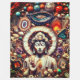 Statue de Bouddha dans une posture méditative ou bénédiction, entourée d'un agencement étonnant de pierres précieuses, minéraux et géodes colorés. L'arrière - plan est rempli de différents types de pierres, y compris des agates et des géodes, créant une mosaïque dynamique et détaillée. Les éléments naturels et l'agencement artistique rendent l'image visuellement frappante et intéressante.