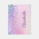 Cute couverture en toison avec parties scintillant arc-en-ciel imitant la goutte contre un arrière - plan rose. Personnalisez avec son nom en écriture violette.