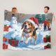 Illustration de vacances pleine de charme avec un chien gai jouant dans la neige, portant un chapeau de Père Noël et entouré de boîtes cadeaux colorées. Dans l'arrière - plan, les enfants construisent un bonhomme de neige à côté d'un sapin de Noël enneigé, créant un merveilleux pays hivernal. Parfait pour répandre la joie des fêtes et capturer la magie de Noël.