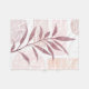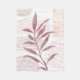 An abstract watercolor featuring patterned shapes and a botanical in a palette of maroon and soft calming colors.