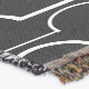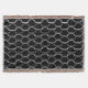 Cette couverture de lancer a un design art déco de demi-cercles blancs se connectent avec des lignes sur un champ de noir.