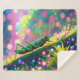 Une sauterelle verdoyante grimpe sur une pente colorée et rêveuse entourée d'orbes lumineuses et d'un feuillage luxuriant. L'arrière - plan regorge d'un éventail éclatant de lumière et de couleurs, créant un environnement surréaliste et enchanté.