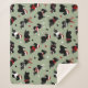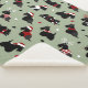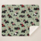 Chiens écossais mignons habillés de tenues de vacances festives, chapeaux de Père Noël et chandails de Jacquard avec des ornements de Noël éparpillés sur un arrière - plan vert.
